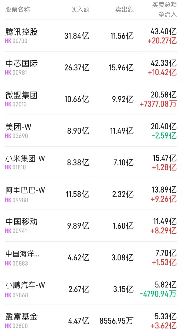 北水净买入最多的个股是腾讯(00700)、中芯国际(00981)、阿里巴巴-W(09988)。北水净卖出最多的个股是小鹏汽车-W(09868)。
