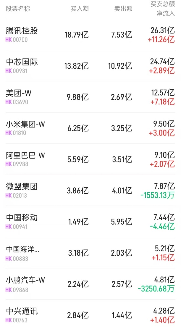 此外,小米集团-W(01810)、中兴通讯(00763)分别获净买入4.27亿、1.39亿港元。