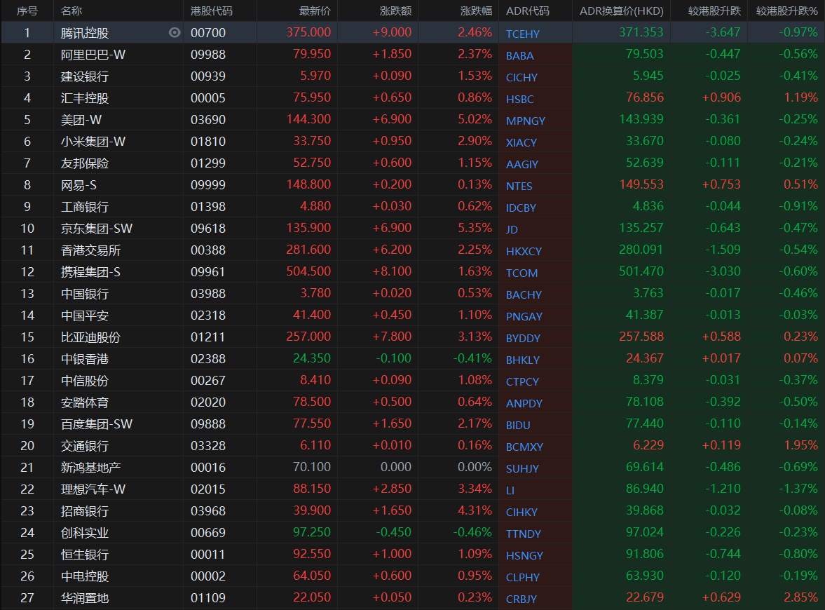大型蓝筹股涨跌不一,汇丰控股收报76.856港元,较香港收市涨1.19%;腾讯控股收报371.353港元,较香港收市跌0.97%。