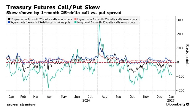 防范长期国债抛售的成本继续高于曲线前端和腹部。长期债券合约中有利于看跌期权的期权偏斜仍接近今年的最高水平。这一走势与上周五就业报告后美债收益率的攀升相吻合,该报告公布后,美债收益率一路走高,令5%的10年期国债收益率重新成为交易员的关注焦点。
