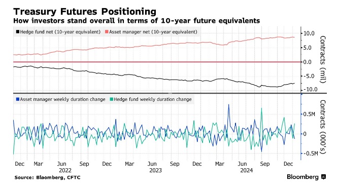 美国商品期货委员会(CFTC)截至1月7日的数据显示,对冲基金大举回补整个期货市场的空头头寸,风险规模相当于约26.3万份10年期国债期货,这是自去年11月底以来最大的空头回补。另一方面,资产管理公司净多头头寸被约12.5万份10年期国债期货等价物平仓。
