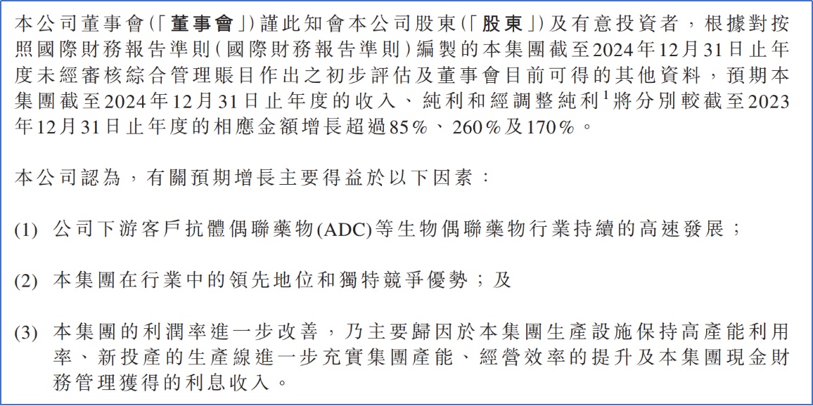 1月15日,根据港交所公告,药明合联(02268)发布了2024年业绩的正面盈利预告。根据公告,公司预测其2024年全年的收入、净利润和经调整净利润分别同比将增长超过85%、260%和170%。