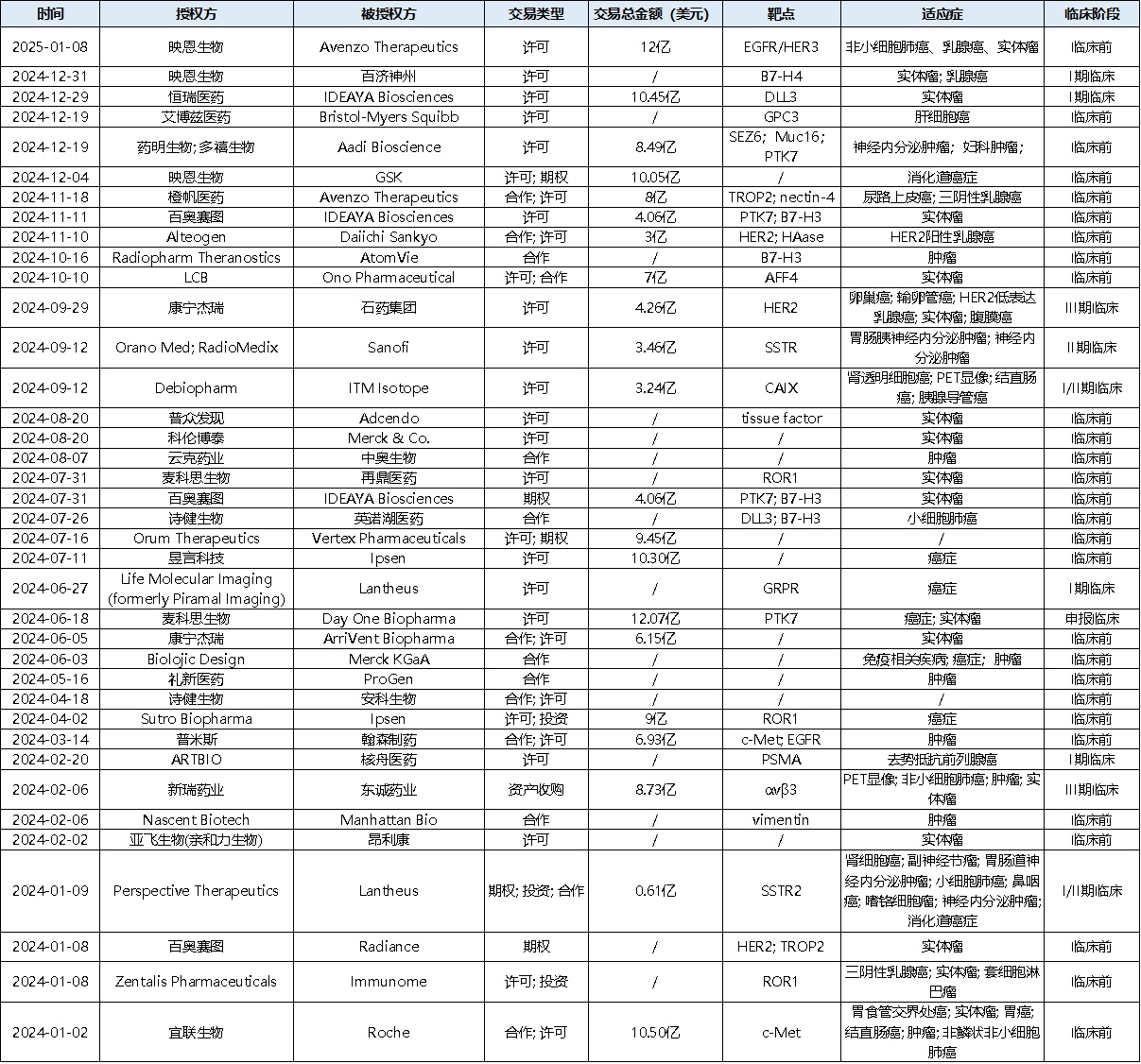 2024年1月至目前全球ADC/XDC部分交易一览表