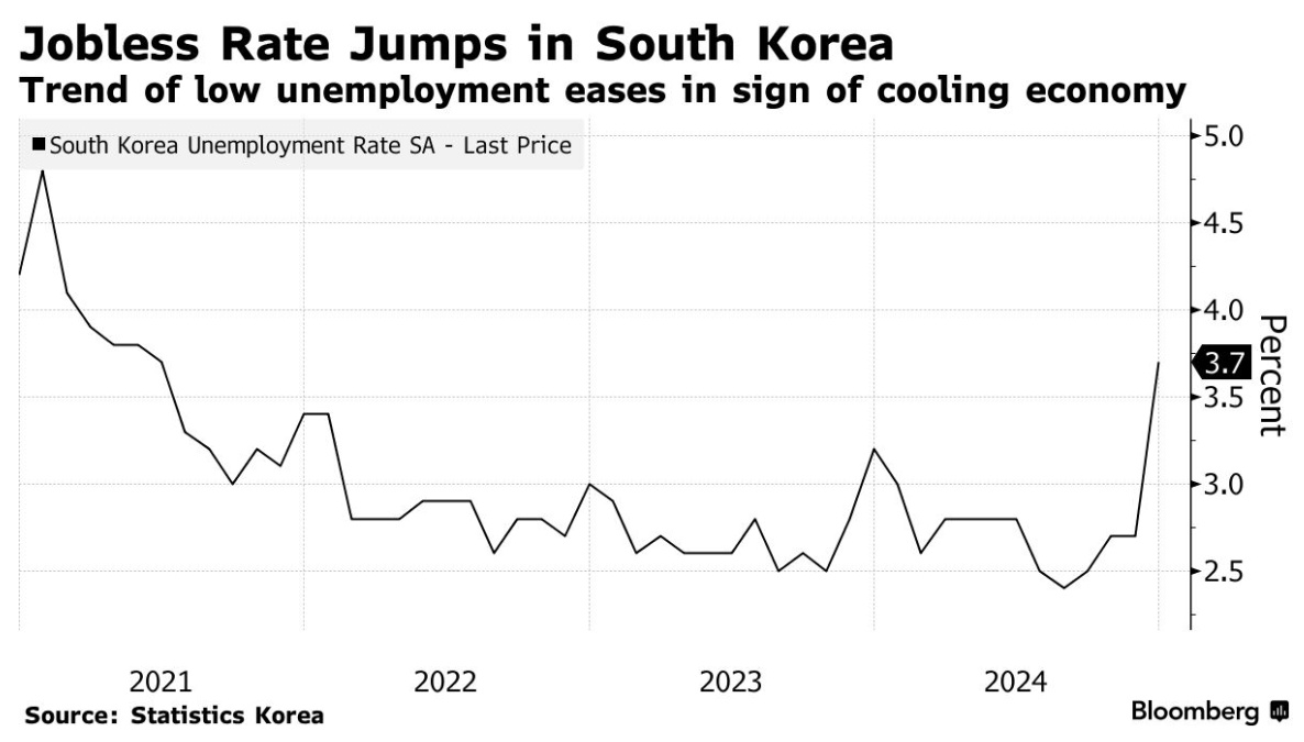 韩国国家统计局周三发布的数据显示,经季节性调整后的失业率从上个月的 2.7% 跃升至 12 月份的 3.7%,创下 2021 年 6 月以来的最高水平。此外,韩国就业岗位较上年同期减少 5.2 万个,这是自 2021 年 2 月以来的首次萎缩。