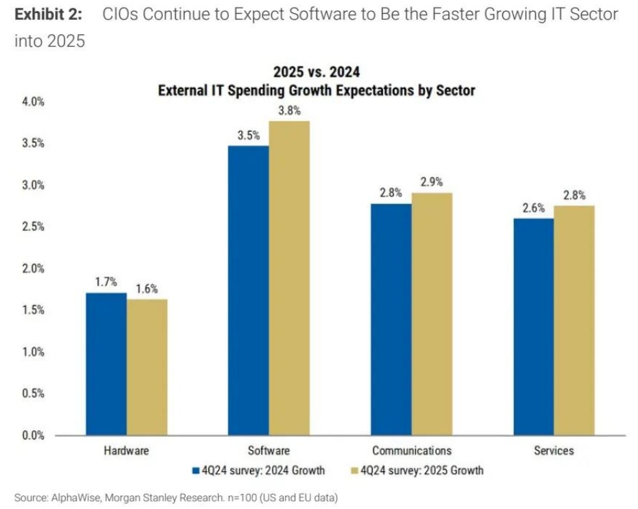 与此同时,24年第四季度对2025年预算增长的预期(同比增长3.7%)略有改善,而第三季度的预测为同比增长3.6%。重要的是,IT预算增长预期继续向调查时间较长的方向上升(10年平均+4.1%)。在行业层面,ClO预计2025年软件(同比增长30个基点至3.8%)、通信(同比增长13个基点至2.9%)和IT服务(同比增长15个基点至2.8%)的支出将加速增长。大摩的数据显示,2025年硬件支出预计将适度减速(同比增长8个基点至1.6%)。