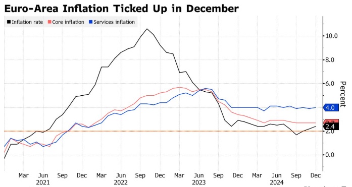 欧洲央行行长拉加德去年12月承诺,在设定利率时将继续遵循“依赖数据、逐个会议的方法”。至少在欧洲,自那以来的数据几乎没有偏离预期。虽然一些交易员可能已经将注意力集中在了近期通胀的升温上,但欧洲央行此前已预示了年底通胀的回升。欧洲央行的分析师认为,物价涨幅的整体回落将如预期的那样进展,并预计2025年工资上涨的压力会减轻。与此同时,即使在特朗普开始征收关税之前,欧元区经济仍在苦苦挣扎。