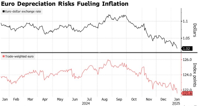 自9月30日以来,欧元贸易加权汇率下跌约3%,欧元兑美元汇率下跌逾8%,危险地接近平价。上一次突破这一水平是在2022年,当时俄乌战争爆发,导致能源价格飙升。