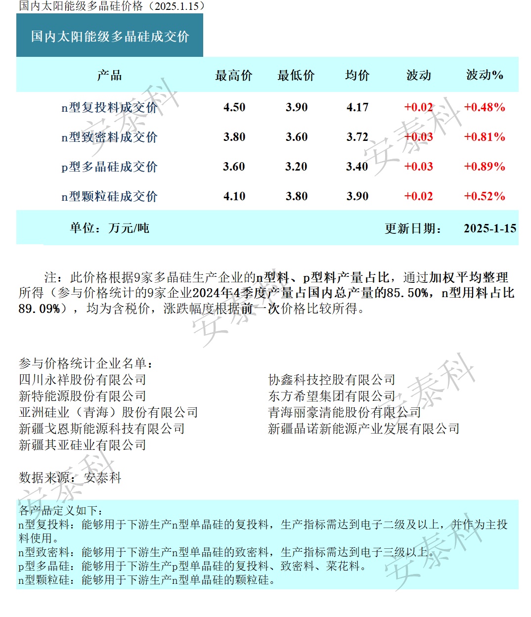 智通财经APP获悉,硅业分会1月15日发文称,本周多晶硅成交价格小幅上涨。n型复投料成交价格区间为3.90-4.50万元/吨,成交均价为4.17万元/吨,环比上涨0.48%,n型颗粒硅成交价格区间为3.80-4.10万元/吨,成交均价为3.90万元/吨,环比上涨0.52%。p型多晶硅成交价区间为3.20-3.60万元/吨,成交均价为3.40万元/吨,环比上涨0.89%。