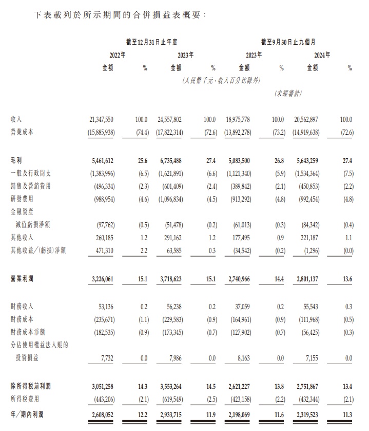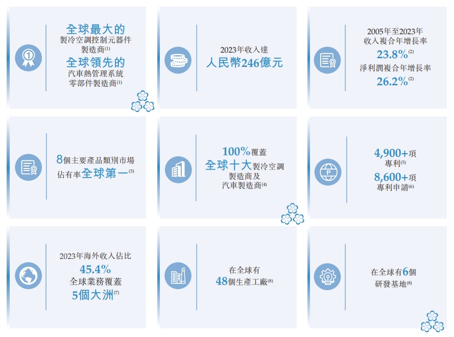 财务方面,于2022年、2023年、2024年截至9月30日止九个月,三花智控分别录得收入约为213.48亿元、245.58亿元、205.63亿人民币,同期利润分别约为26.08亿元、29.34亿元、23.20亿元人民币。