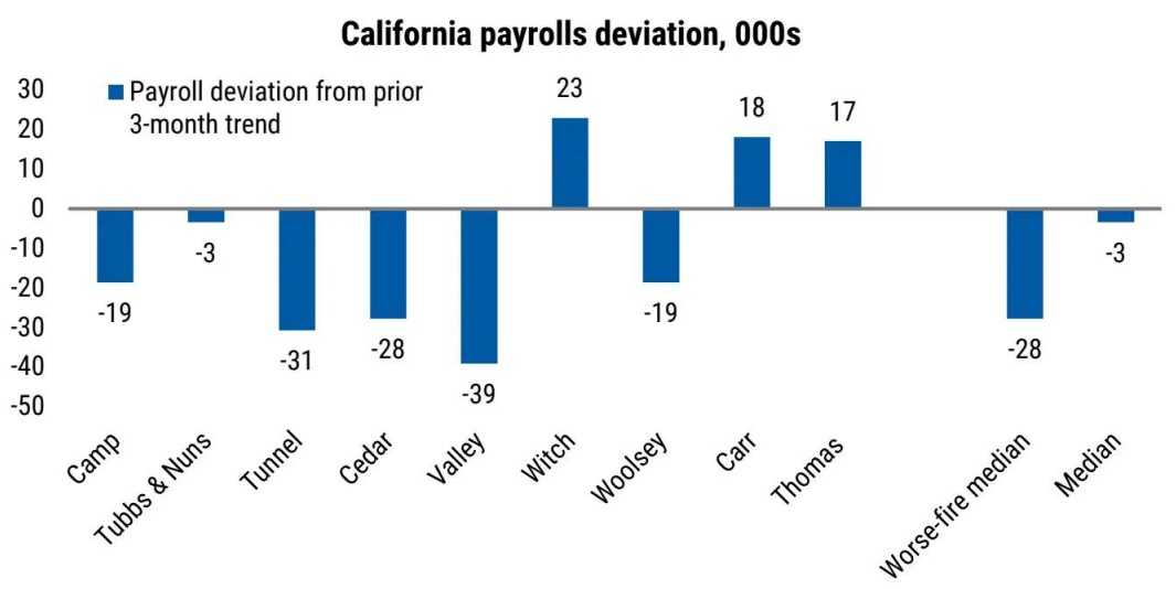 2)大摩表示,对就业人数的拖累是典型的,但并不确定。在过去的野火期间,加州的就业人数在低于3.9万人到高于2.3万人的趋势之间波动,历史均值为下降3万人。申请失业金的人数并没有为就业缺口的规模提供多少指引。大摩预计,最近的火灾将使加州1月份的就业人数减少2万- 4万人。