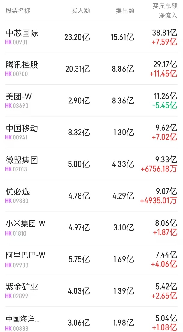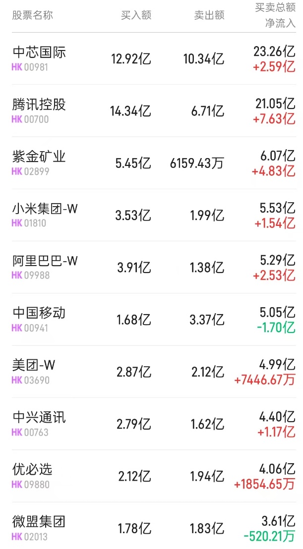 北水净买入最多的个股是腾讯(00700)、中芯国际(00981)、紫金矿业(02899)。