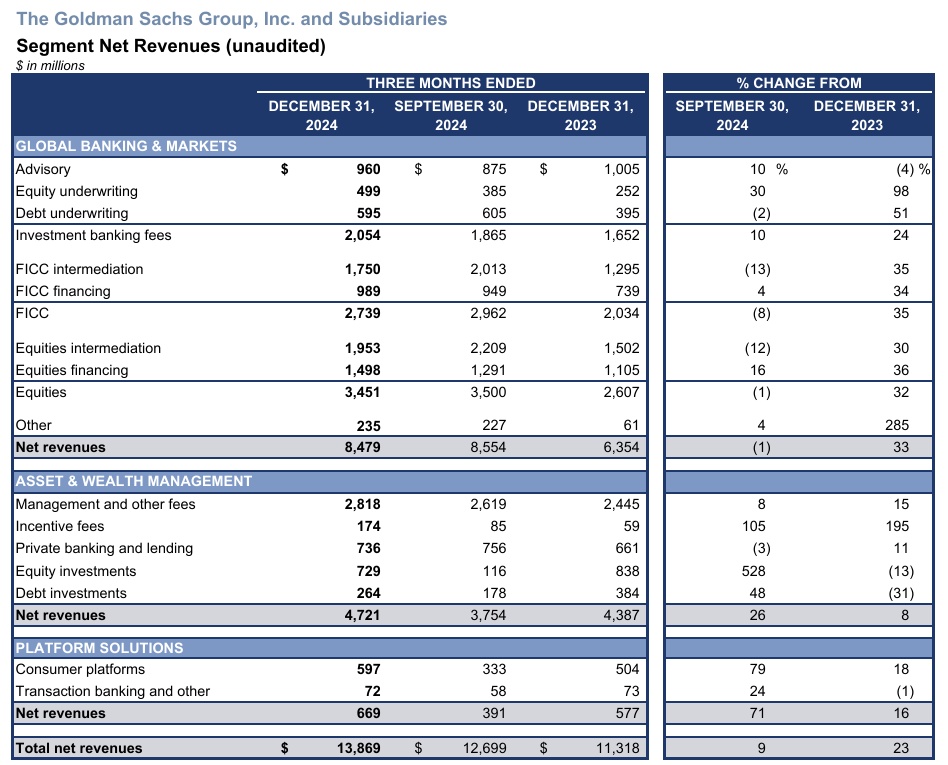 净利润为41.1亿美元,同比增长105%,这得益于投行业务的强劲增长、资产管理业务的扩张以及一项资产负债表押注带来的4.72亿美元意外利得。摊薄后每股收益为11.95美元,大幅好于市场预期的8.21美元,上年同期为5.48美元。