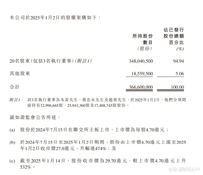 诚如证监会公告所披露,证监会最近曾就本公司的股权分布进行查讯。证监会的查讯结果显示本公司于2025年1月2日有20名股东(包括本公司的3名执行董事(执行董事)合共持有3.48亿股股份,相当于已发行股份的94.94%。因此,只有1855.95万股股份(占已发行股份的5.06%)由其他股东持有。