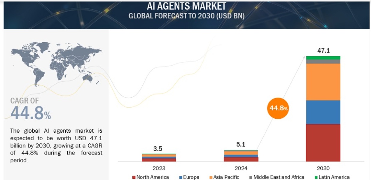 根据调研机构MarketsandMarkets的最新预测报告,人工智能代理市场规模预计将从 2024 年的仅仅 51 亿美元大幅扩张至 2030 年的大约 471 亿美元,期间复合年增长预期高达 44.8%。该机构表示,使用AI代理,企业可以自动化各种非常复杂的流程并减少人工干预以避免频繁出现的人为错误,AI 代理与企业级内部自动化工具的集成将实现从制定产品销售方案到售后服务的一站式AI处理,大幅提升企业经营效率。