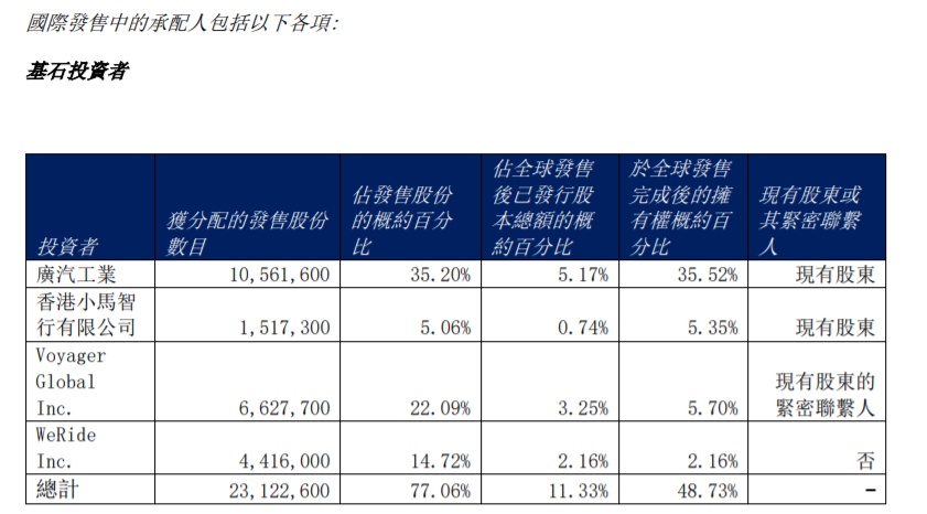 值得注意的是,如祺出行在其国际配售中引入了四位知名基石投资者,其中便包括了广汽工业、Voyager(滴滴自动驾驶)、WeRide(文远知行),它们以35港元的发行价分别认购了如祺出行35.2%、22.09%、14.72%的股份,基石投资者合计认购股份占总发行股份的比例高达77.06%。