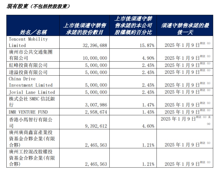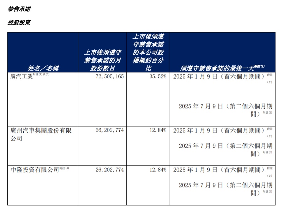 值得注意的是,在1月10日时,如祺出行的控股股东已迎来了第一轮限售解禁。数据显示,广汽工业、广州汽车集团有限公司、中隆投资有限公司分别持有如祺出行股份的比例为35.52%(包括基石股份)、12.84%、12.84%,该等股份可于1月10日在保证控股股东地位的前提下进行有条件卖出(不包括广汽工业的基石股份)。