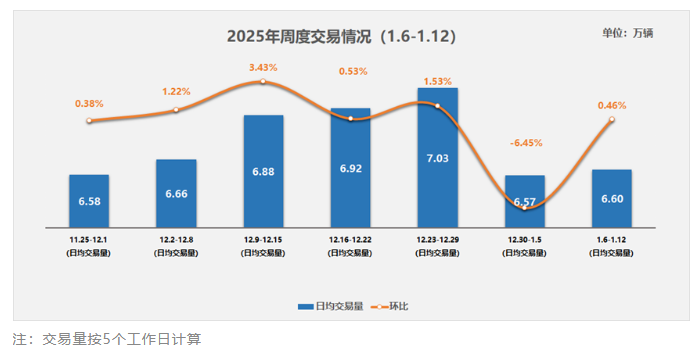 智通财经APP获悉,中国汽车流通协会发布二手车周度快报(2025年1月6日-2025年1月12日)。1月第二周,二手车市场交易量呈现出小幅上涨的趋势,日均交易量攀升至6.60万辆,环比上周增长了0.46%。这一增长主要得益于春节前消费者购车、换车需求的激增,市场客流量活跃,交易量因此得以保持平稳。然而,与去年12月相比,交易量却下降了4%,这反映出当前二手车市场仍承受着一定的压力。据统计,1月1日至12日的累计交易量达到79万辆,较上月下降了3%,进一步证实了市场所面临的挑战。