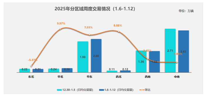 西南地区二手车日均交易量为1.33万辆,环比下降2.45%,近几周市场需求持续走弱。成都和昆明两大市场本周均出现较为明显的下降,其中成都交易量降幅达13%,昆明市场降幅也接近10%。然而,拉萨市场本周需求明显提升,环比增速高达10%,成为西南地区的一个亮点。同时,重庆市场也较上周有所增长,交易量环比增长2.5%。