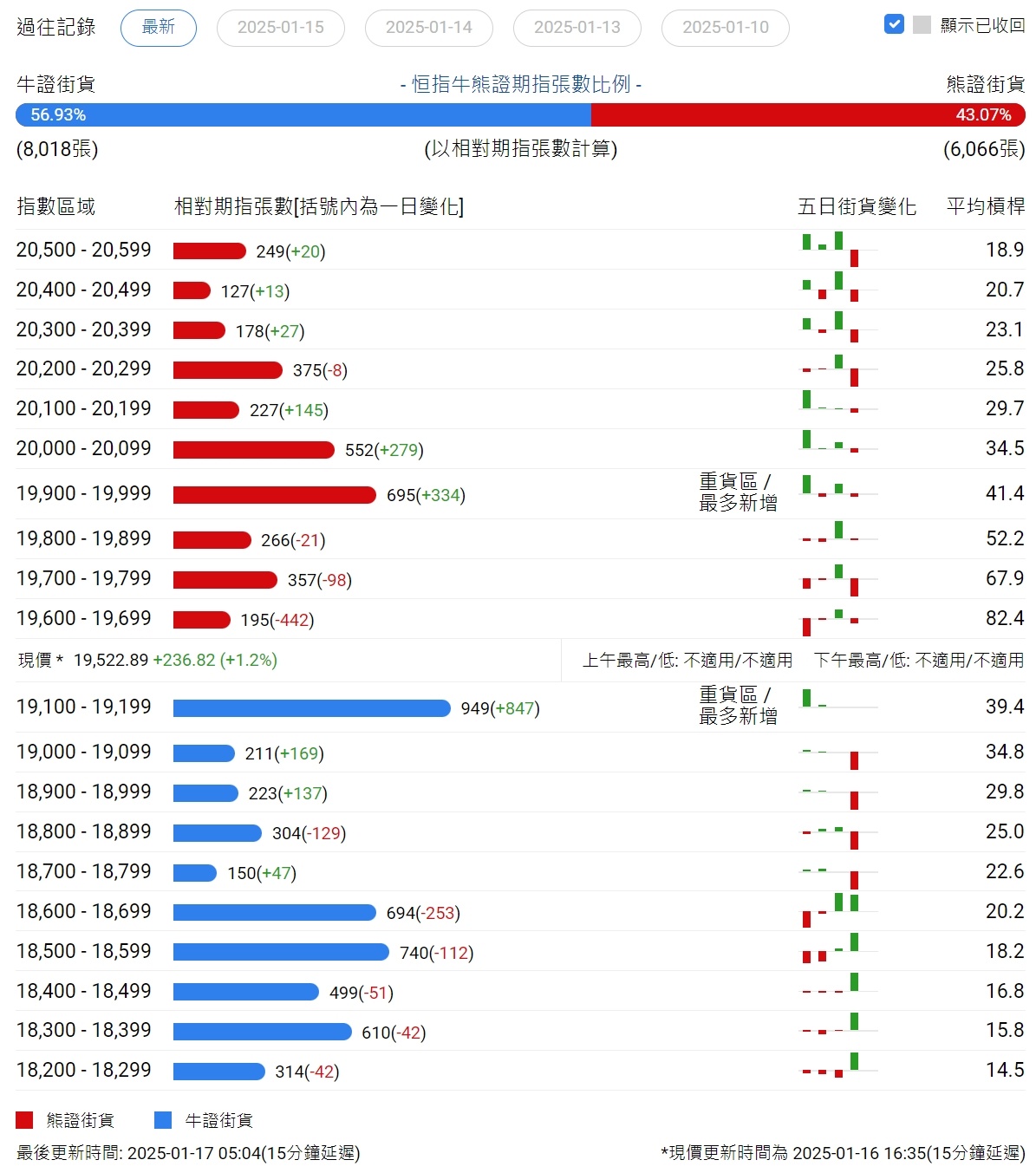 智通财经APP获悉,截至1月17日,恒指最新的牛熊街货比例为57:43。