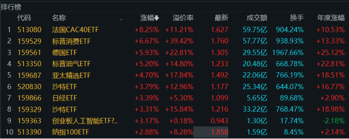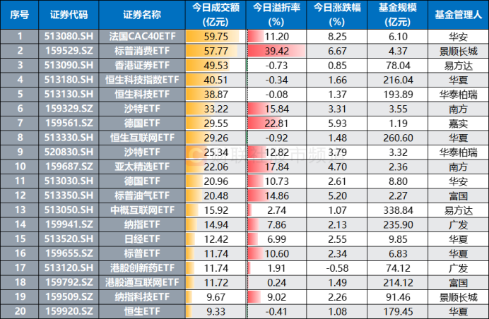 具体基金方面,今日成交额居前的20只跨境ETF中,共有12只ETF目前溢价率在5%以上,整体占比接近六成。其中,法国CAC40ETF(513080)、标普消费ETF(159529)成交额双双超50亿元,香港证券ETF(513090)、恒生科技指数ETF(513180)、恒生科技ETF(513130)、沙特ETF(159329)、德国ETF(159561)等ETF今日量能数据也居前。