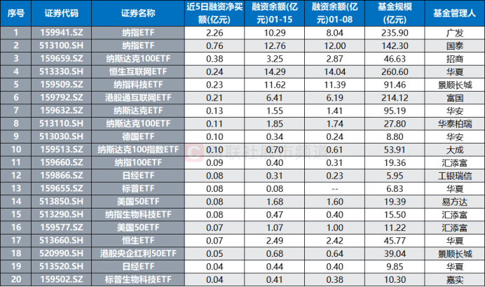 从资金面来看,不少跨境ETF近日获融资客加仓。截至1月15日数据,累计共有35只跨境ETF近5日融资余额获得增长,在整个两融跨境ETF中占比近45%。其中,纳指ETF(159941)、纳指ETF(513100)、纳斯达克100ETF(159659)净买额居前。不过,对于普通投资者而言,仍需审慎投资,并注意跨境ETF的溢价情况,避免因过分追高而遭受资金损失。