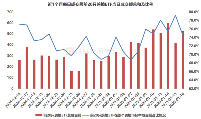 注:近1个月每日成交额前20只跨境ETF当日成交额总和及比例(截至1月16日收盘)