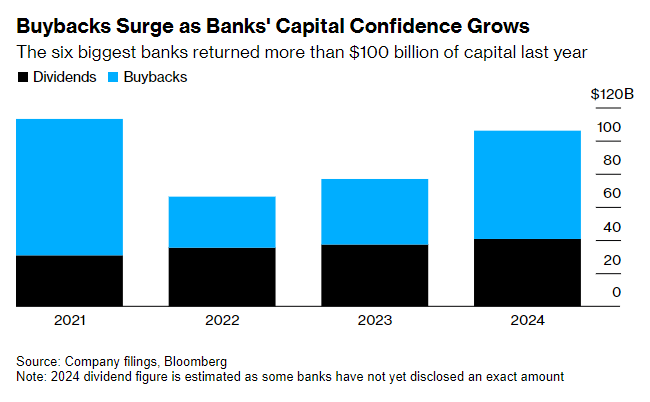 高管们预计在2025年将提供更多的回报。花旗(C.US)一直是美国主要银行中回购最少的一家,该行通常在风险管理和控制方面进行投资,最终通过200亿美元的回购计划满足了投资者的要求,将现金返还给股东。摩根大通(JPM.US)首席财务官Jeremy Barnum表示,该行拥有大量过剩资本,不希望进一步增加。