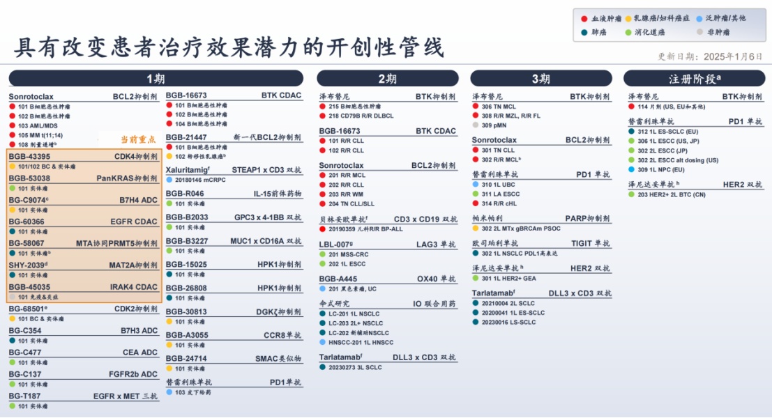在本次JPM大会上,百济神州还披露了截至2025年1月6日的最新研发管线,包括25+款处于1期临床研究阶段的早期管线,以及15+处于2期和3期阶段的管线,涵盖了小分子、抗体、抗体偶联药物(ADC)、CDAC等多种分子类型。
