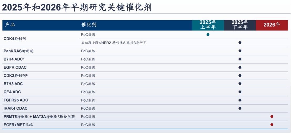 而在上述管线内,多达7款产品未来销售峰值有望达到20亿美元及以上目标,其中包括多款实体瘤管线(小分子、ADC、降解剂等),和自免领域的IRAK4 CDAC等。