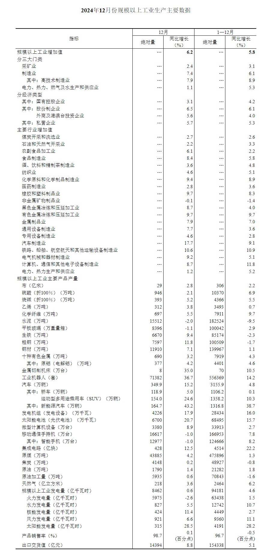 12月份,规模以上工业增加值同比实际增长6.2%(增加值增速均为扣除价格因素的实际增长率)。从环比看,12月份,规模以上工业增加值比上月增长0.64%。2024年,规模以上工业增加值比上年增长5.8%。