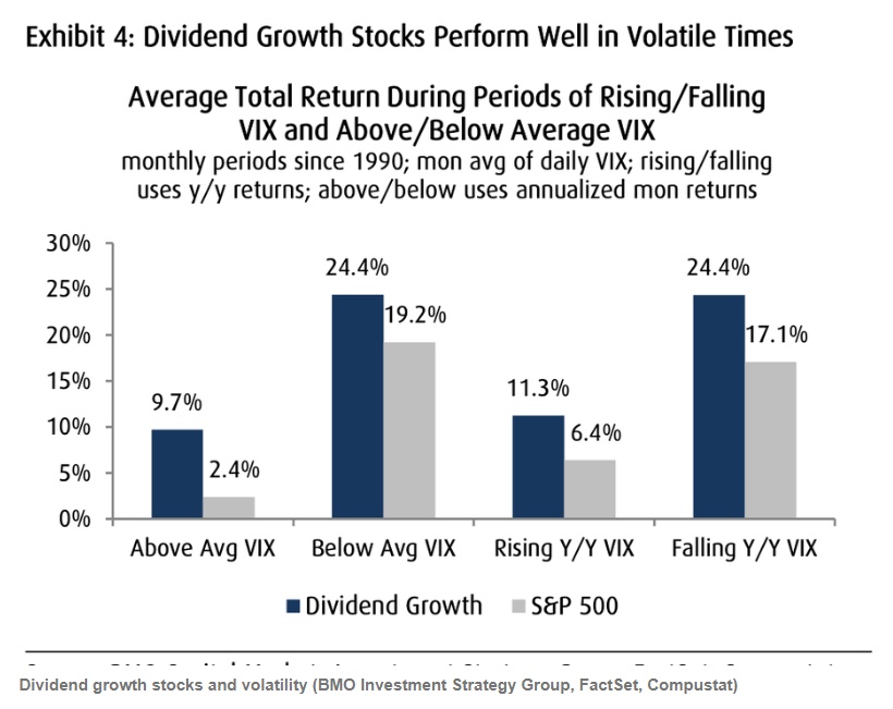 这位策略师表示,与波动性上升时的标普500指数相比,其关注的股息增长股历来显示出稳定的年化回报率: