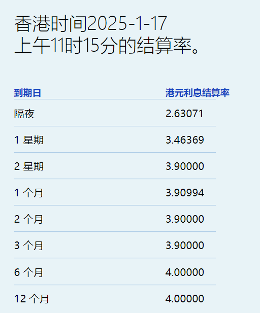 港元拆息连续三日全线向下 一个月拆息四连跌报4.05% 创逾两个月低