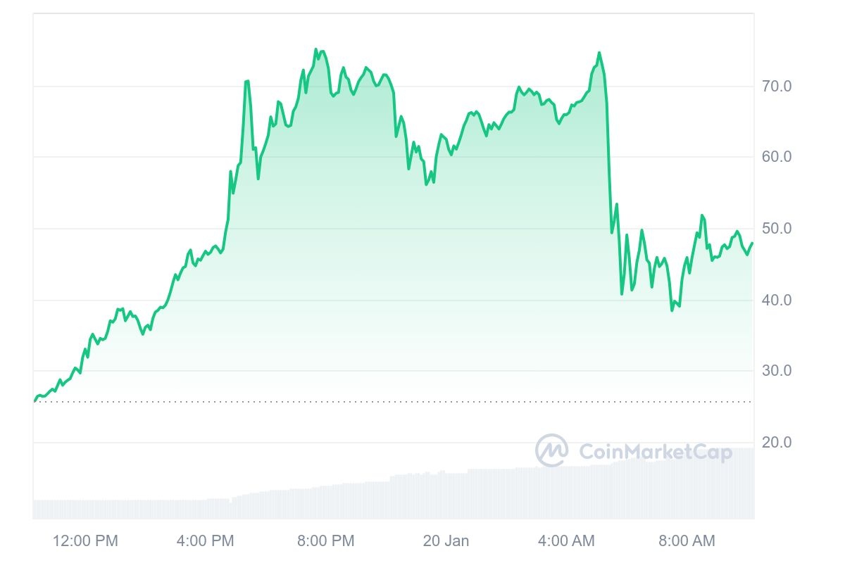 与此同时,CoinMarketCap的数据显示,“特朗普币”市值蒸发了50亿美元,其价格在40分钟内从74.6美元下跌至45.9美元,跌幅达38%。