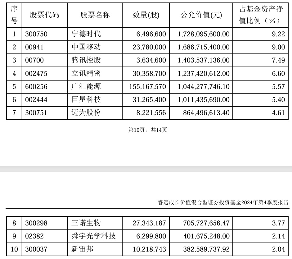 智通财经APP获悉,1月20日,睿远成长价值混合基金、睿远均衡价值三年持有混合基金、睿远稳进配置两年持有混合基金、睿远稳益增强30天持有债券基金披露四季报。其中,知名基金经理傅鹏博、朱璘管理的睿远成长价值混合适度提高了股票类资产配置,股票仓位为88.7%,环比增加3.7%,前十大持仓在基金资产净值中的占比为55.8%,环比2024年三季度提高约1.4%。舜宇光学科技(02382)新进入该基金前十大重仓股,万华化学(600309.SH)退出前十大重仓股。