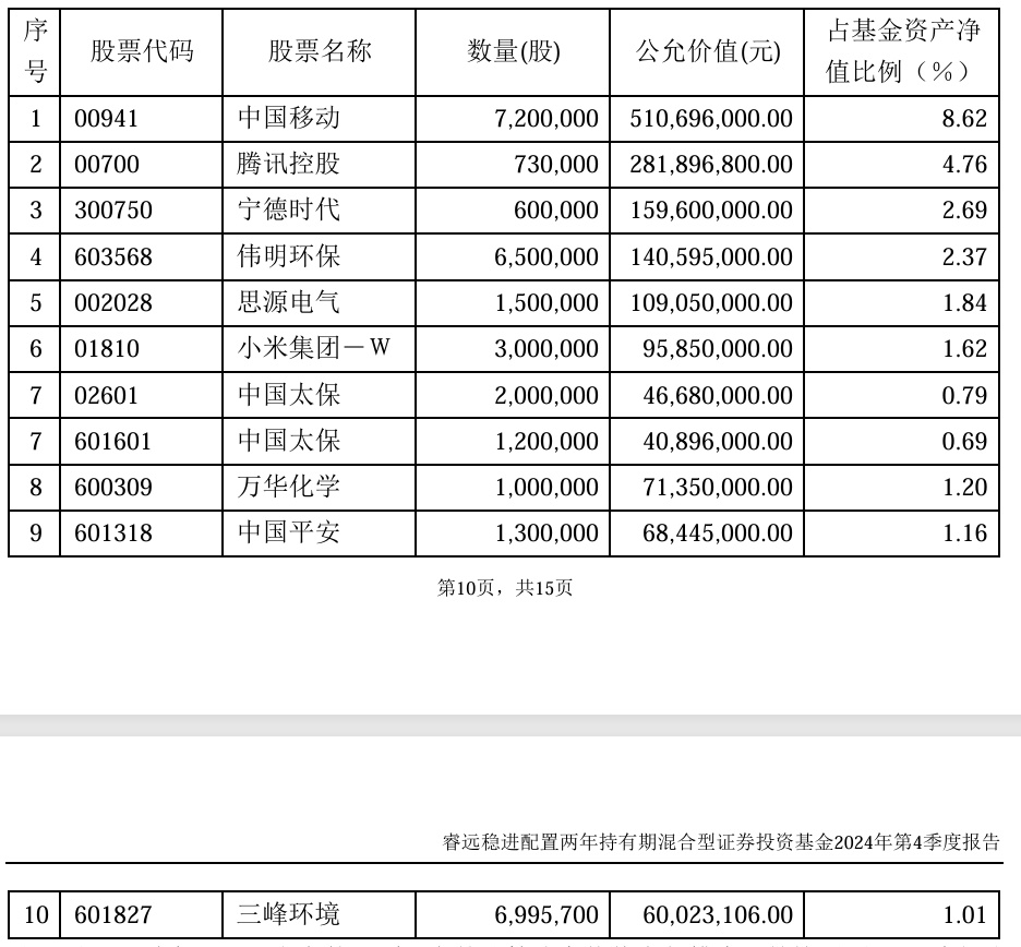 与上一季度相比,睿远基金旗下饶刚、侯振新管理的睿远稳进配置两年持有期混合型基金前十大重仓股新增小米集团-W(01810)、中国平安(601318.SH)、三峰环境(601827.SH);其中中国移动(00941)持仓占比8.62%,仍然为该基金第一大重仓股。