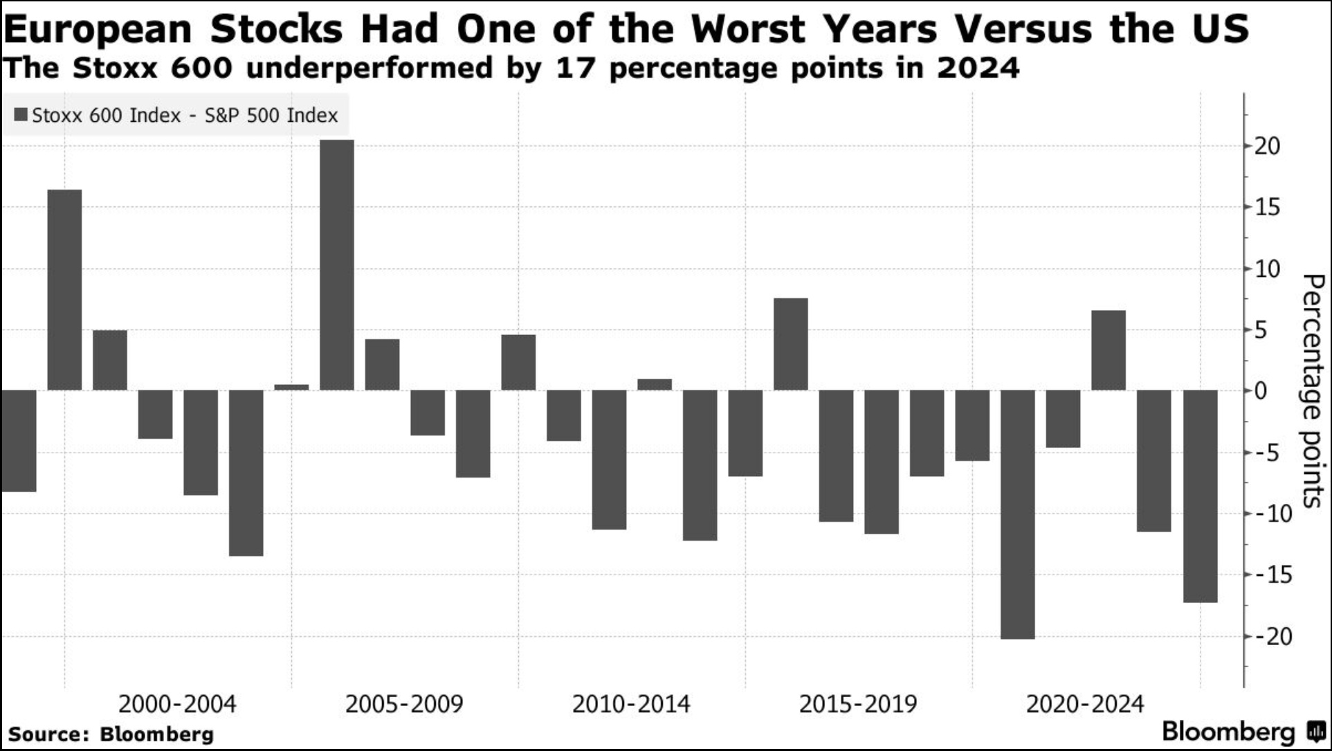 根据彭博社汇编的数据,去年,欧洲斯托克600指数以当地货币计算的表现落后于标普500指数17个百分点以上,这是自1998年该基准指数创建以来第二差的表现。美国经济的强劲增长以及对科技巨头的强劲需求是造成这一差距的主要原因。