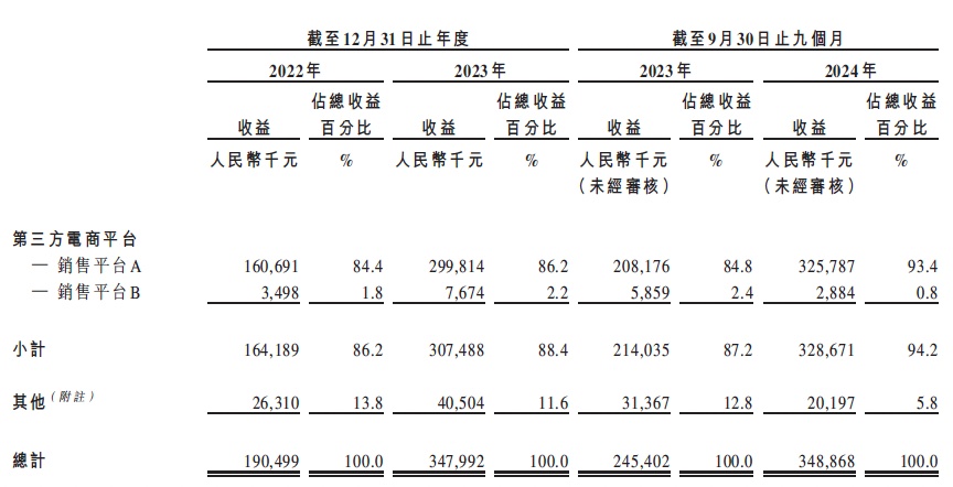 不仅如此,若以销售渠道划分,聚智科技的“偏科”似乎更加严重。2022年-2024年前9月,公司来源于电商平台A(亚马逊公司辖下电商平台,下同)的收入占比分别达到84.4%、86.2%、93.4%,比例不仅始终维持高位,且还呈现出进一步上升的趋势。