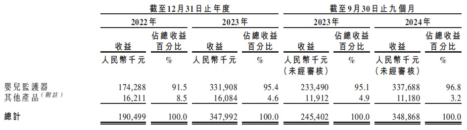 从财务表现来看,过去几年间聚智科技的规模经历了较大的跃升。2022年-2024年前9月,公司的收入分别为1.9亿元(人民币,下同)、3.48亿元、3.49亿元。拆分收入结构,聚智科技绝大部分收入均来源于婴儿监护器产品,上述期内该产品的收入占比分别达到了91.5%、95.4%、96.8%。同期,公司还有少部分收入来源于家用电讯产品、即影即有儿童相机、婴儿监护器配件及元件等产品,但规模均较小。