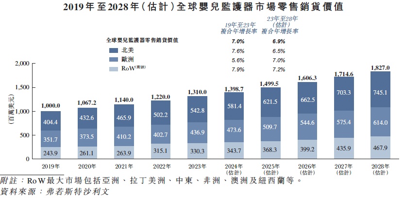 在婴儿安全产品需求上涨、婴儿健康意识提高以及智能科技进步的推动下,全球婴儿监护器市场在过去几年间得到了长足的发展。数据显示,2023年全球婴儿监护器的销量为1870万台,至2028年有望达到2760万台;而在2023年,该市场的零售销货价值约为13.1亿美元,到2028年有望扩容至18.27亿美元。