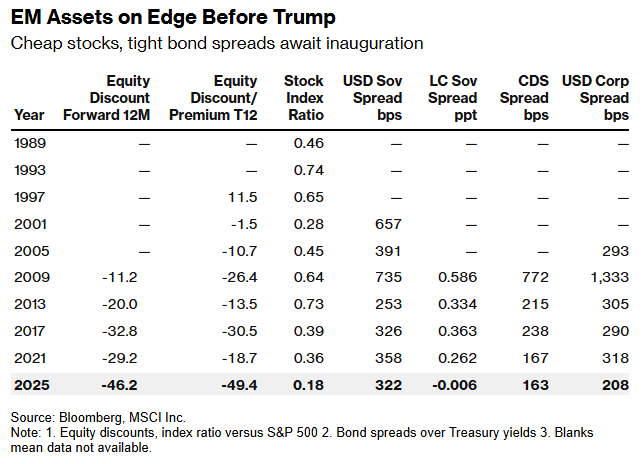 智通财经APP注意到,周一,新兴市场为唐纳德·特朗普的第二任期做好准备,股市创下美国总统就职日有史以来最大的估值折价,一些债券利差也达到就职日以来的最高水平。