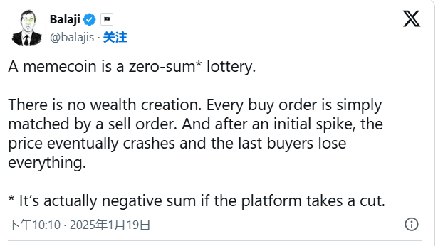 在X上的一篇帖子中,天使投资人、美国加密货币交易所Coinbase Global前首席技术官巴拉吉·斯里尼瓦桑表示,meme加密货币本质上是一种零和“彩票”,其“价格最终会崩溃,最后的非理性买家会失去一切”。