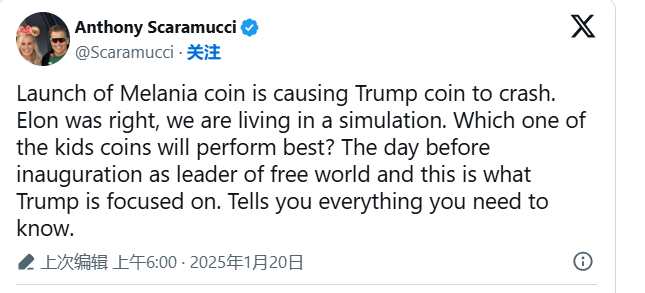 在另一篇帖子中,来自SkyBridge Capital的创始人安东尼·斯卡拉穆奇指出,梅拉尼娅币的发行导致特朗普币大幅贬值。斯卡拉穆奇曾经在2017年特朗普首次担任美国总统期间短暂地担任其通讯联络主管,之后被解雇并成为直言不讳的美国政府批评者。“马斯克说得对,我们生活在一个仿真环境中。”斯卡拉穆奇在X的一份帖子中指出。