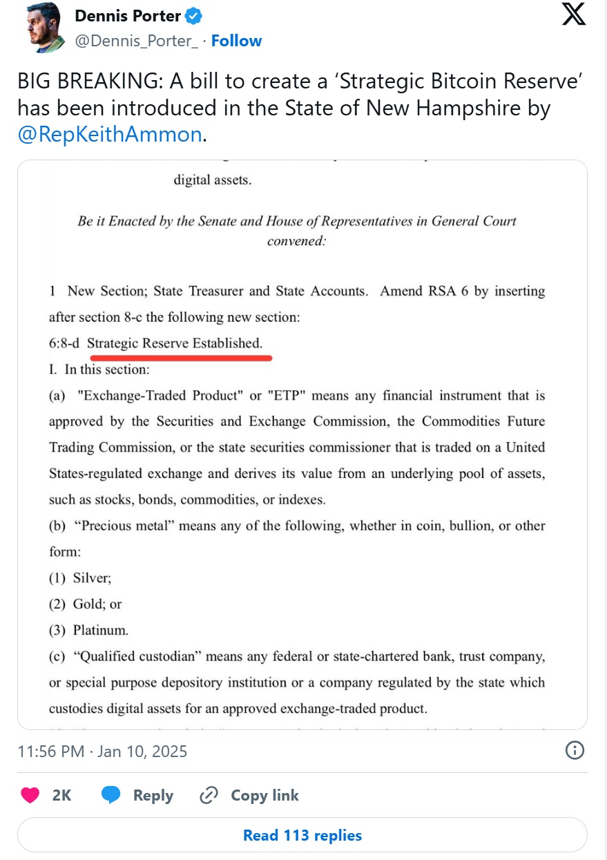 总部位于俄勒冈州波特兰的非营利性比特币倡导组织Satoshi Action Fund的创始人丹尼斯·波特(Dennis Porter)表示,他是推动其他几个州出台战略性比特币储备立法的主要推动者。该组织成立于2022年,波特告诉彭博新闻社,自11月大选以来,他的组织通过与当地立法者合作提出战略储备法案,“大大扩大了各州购买比特币的工作范围”。