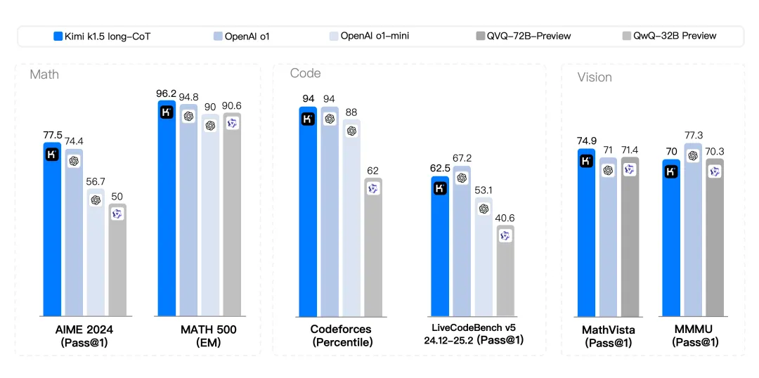 同一天,Kimi全新SOTA模型——k1.5多模态思考模型上线。在long-CoT模式下,Kimi k1.5的数学、代码、多模态推理能力,也达到长思考SOTA模型OpenAI o1正式版的水平。官方表示,这应该是全球范围内,OpenAI之外的公司首次实现o1正式版的多模态推理性能。Kimi技术团队第一次准备了详细的技术报告。