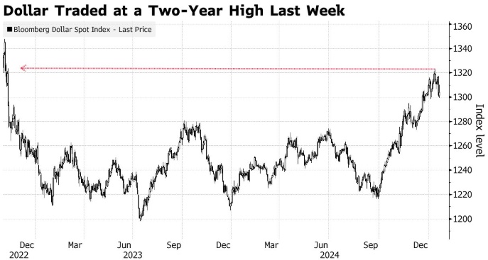 特朗普采取这一举措之前,美国的高利率和强劲的经济增长使美元对从欧元到日元的所有货币都处于高位,巩固了其在每天7.5万亿美元的外汇市场中的主导地位。美元进一步升值的前景可能会让其他国家保持警惕,并可能引发新一轮干预以支撑本国货币。