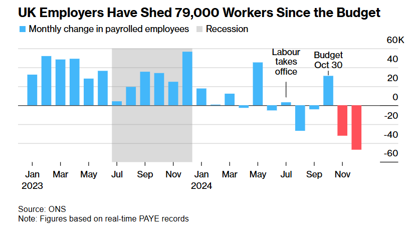基于英国税务记录的数据显示,在12月减少4.7万就业人数后,英国就业人数降至一年多来的最低水平。这是连续两个月下降,这将加剧人们的担忧情绪,即执政党工党所提出的260亿英镑(大约319亿美元)的雇主国家保险上调正在导致企业大幅裁员。