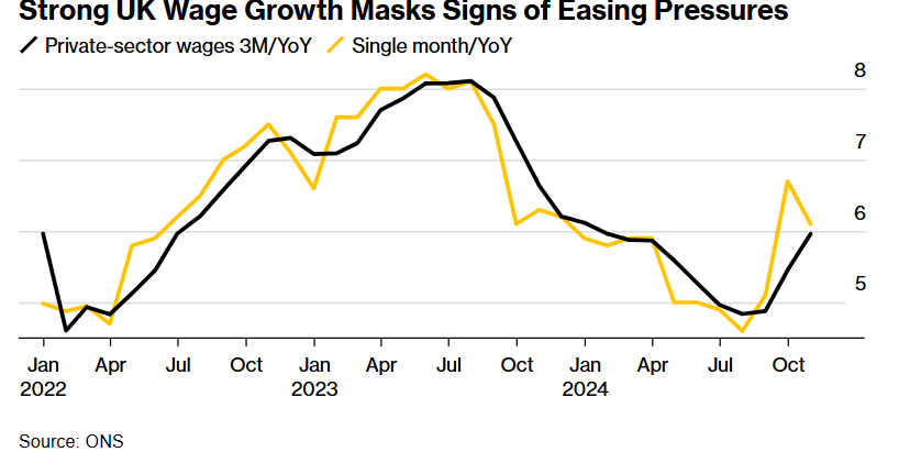 英国央行最密切关注的经济指标——即私营部门的薪资增速,从5.5%加速扩张至6%。然而,有显著信号显示,在英国财政大臣雷切尔·里夫斯 (Rachel Reeves) 10 月份的最新预算案公布后,英国劳动力市场出现了进一步宽松的迹象。
