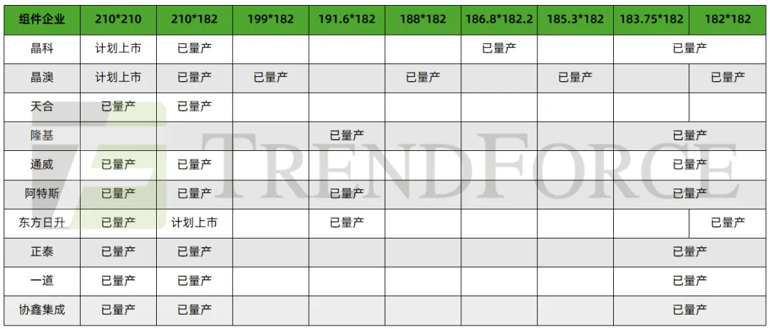 目前,主流企业聚焦210与N型布局,大尺寸产能占比突破95%,166及以下组件空间受挤 。TrendForce集邦咨询预计,2025年大尺寸组件产能预计将达1351GW,市场占有率约98%,其中210及210R尺寸组件占比达85.7%。