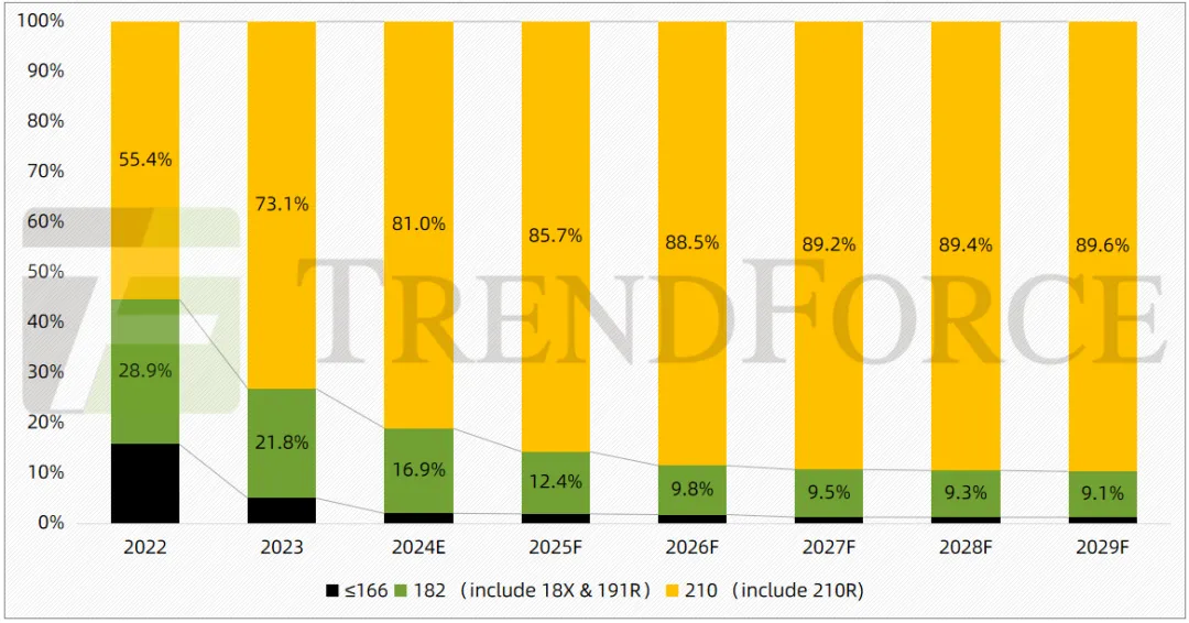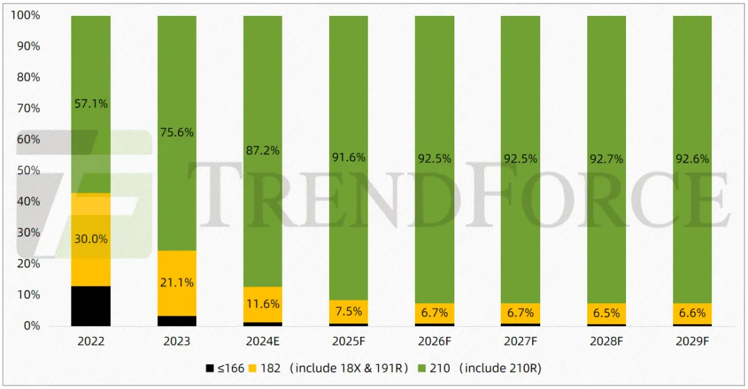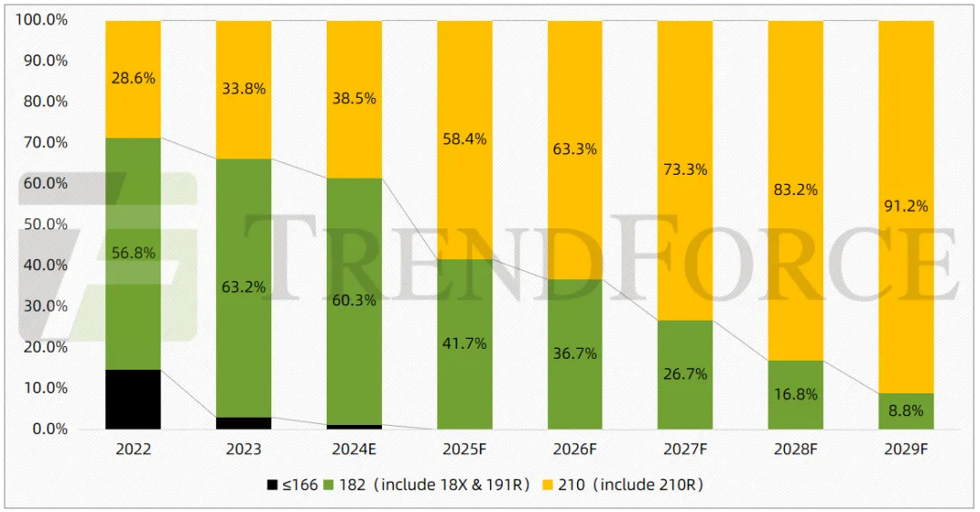 2024年下半年,随着天合光能、晶科能源、晶澳科技等头部厂商210/210R TOPCon电池产能的释放,210及210R硅片尺寸的产出占比快速提升,此外,专业化企业加速从182L向210R或210迭代升级,硅片市场竞争版图重塑。TrendForce集邦咨询预估,随着210R N的电池需求在2025年Q2开始大规模放量及182L尺寸的迭代升级,210及210R尺寸产品渗透率维持上升趋势,合计占比将达58.4%,而182 阵营因功率不具备优势,呈现瓦解态势,预计2025年182(含18X及191R)尺寸硅片产出占比将从2024年的60.3%大幅下降至41.7%。未来几年,210及210R硅片产能占比仍将一路攀升,预计2029 年突破90%大关,达91.2%,而182尺寸产品市场份额低于10%,逐步退出市场 。