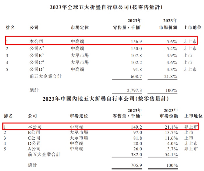 日前,大行科工(深圳)股份有限公司(以下简称“大行科工”)向港交所主板递交了上市申请。大行科工作为一家业内颇具影响力的折叠自行车公司,旗下大行品牌久负盛名,灼识咨询的资料显示,以2023年零售量计算,大行在中国内地及全球折叠自行车行业均排行第一,市场份额分别为21.1%及5.6%。